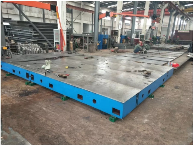鉚焊平臺用于鉚焊工藝的基礎平板,工作面上有孔和T型槽,孔主要用來清理鉚焊時的一些鐵渣和焊接廢棄物,T型槽主要是用來固定焊接件。